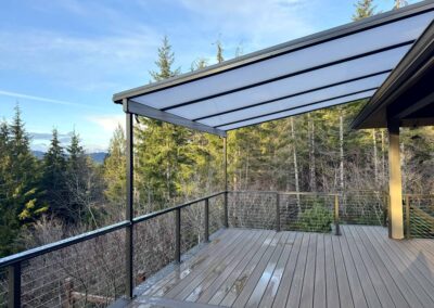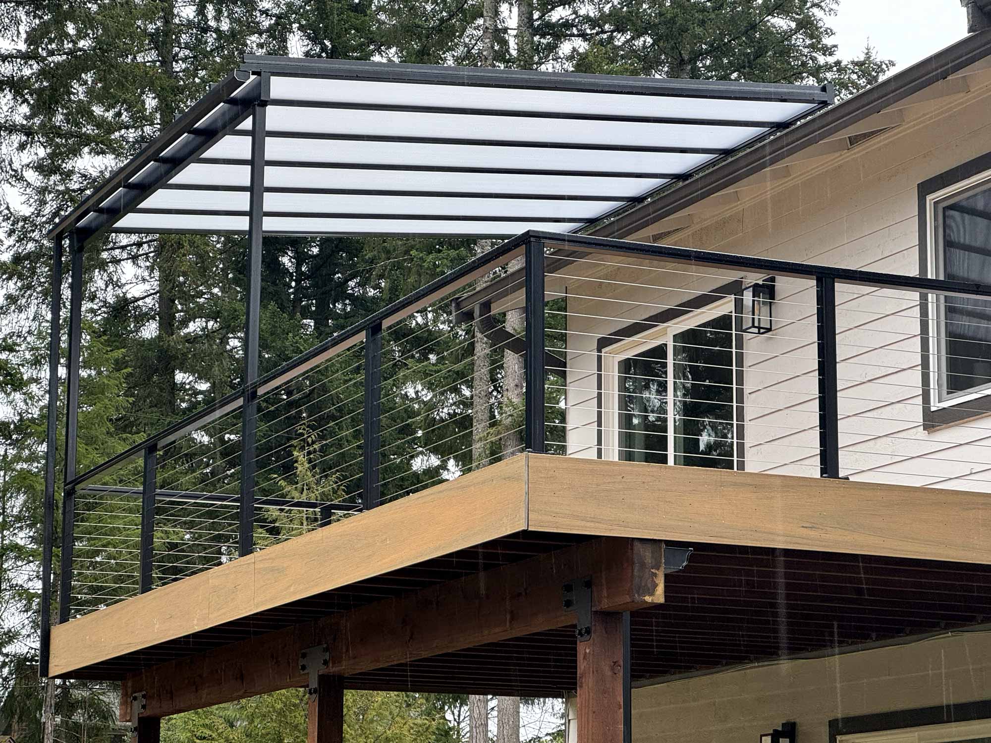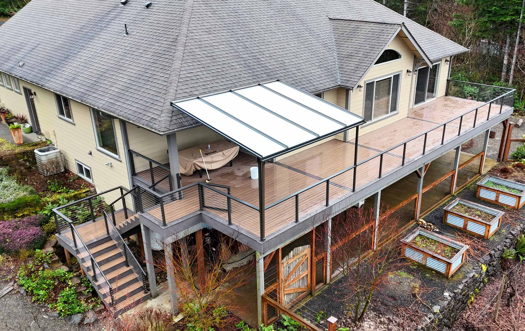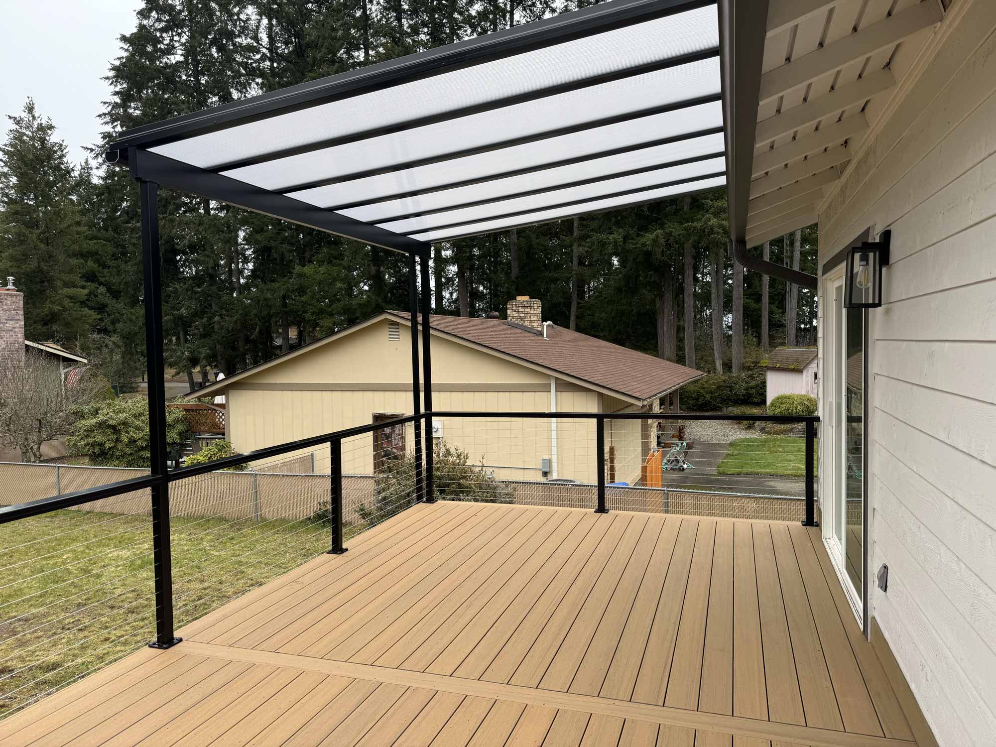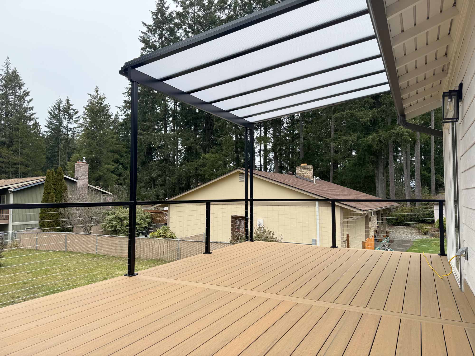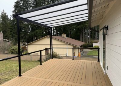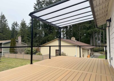 Railmasters patio covers and awnings are built with powder-coated aluminum framing and high-performance roof panels including acrylite, polycarbonate, or tempered glass. Designed for modern outdoor living, they provide durable, low-maintenance protection while maximizing natural light. A sealed track system with concealed fastening ensures a clean, waterproof finish suitable for decks and patios in all weather conditions.